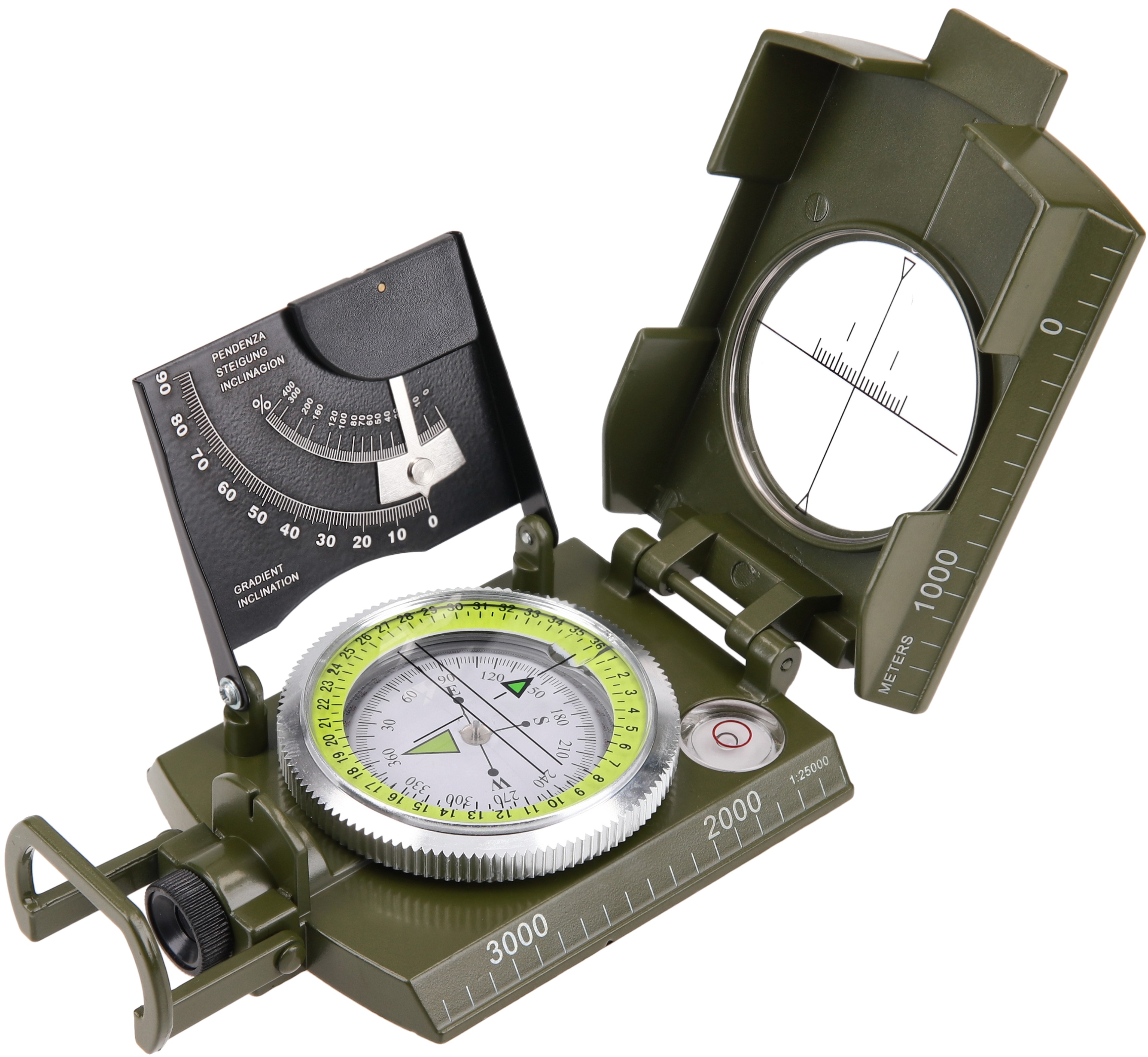 Кришка компаса оснащена візиром з кутомірною шкалою та збільшувальною лінзою, що дозволяє точно визначати азимут на віддалені об'єкти. Вбудований клинометр з напівлімбом використовується для вимірювання кутів нахилу та падіння, а бульбашковий рівень допомагає вирівнювати компас для точних вимірювань. На задній кришці розміщена таблиця з корисними формулами.