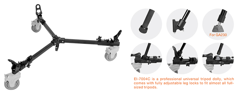 Штативний візок E-Image EI-7004C розрахований на навантаження до 60 кг. Особливість цієї модель в тому, що кожна секція оснащена ковзаючим замком-фіксатором (як на лижах). Кожен такий замок можна переміщати по довжині секції візка і затягувати в потрібній позиції за допомогою гвинта. Тому на цей візок можна встановлювати штативи в будь-якому положенні. Крім того, EI-7004C розрахований на встановлення триподів не тільки з плоскими опорами "ніг", але також з подвійними шипами (E-Image760AT) і гумовими накладками (E-Image GA230).