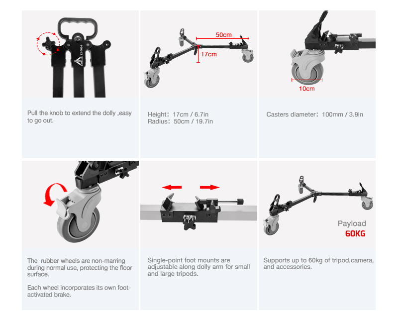 Всі 4-дюймові коліщатка оснащені індивідуальною гальмівною колодкою. Конструкція штативного візка E-Image EI-7004C містить зручну ручку, яка полегшує складання і транспортування.
