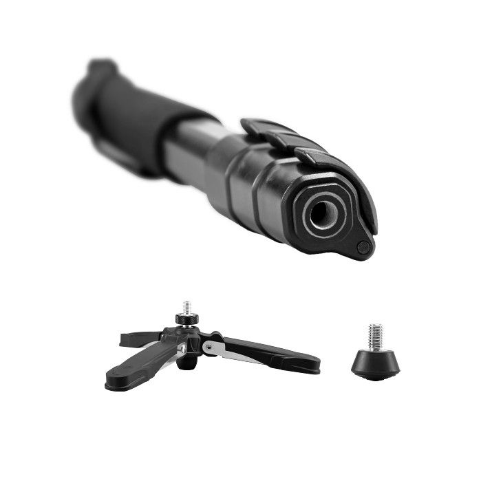 Монопод виготовлений із алюмінію, на верхній секції є зручна накладка із пористого матеріалу. Рідинний рівень допоможе правильно виставити обрій. Нижня опора знімається і дозволяє трансформувати монопод міні штатив за допомогою різьбового з'єднання 3/8 дюйма.