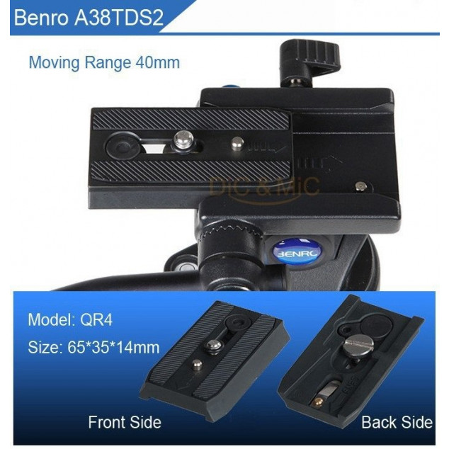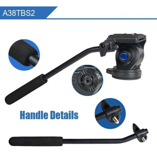 - Відеоголова Benro S2: Забезпечує м'який хід, регулювання нахилу (+90° / -80°), панорамування на 360°, має бульбашковий рівень та знімний майданчик QR4.