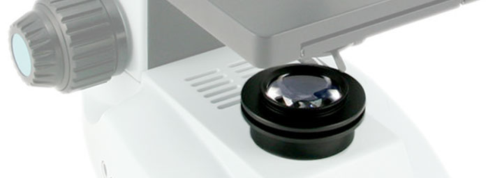 Первоначально под отверстием в штативе для образца находилось зеркало на поворотном креплении. Пользователь вручную перемещал зеркало, чтобы отразить свет от внешнего источника, например, фонаря или лампы. Позже была введена лампа накаливания, а сейчас используются светодиоды, хотя многие начинающие модели все еще предлагаются с зеркалами. С бортовым освещением появились реостаты для управления яркостью. Если образец загораживал свет снизу, для освещения верхней поверхности можно было использовать внешнюю лампу. Сегодня некоторые микроскопы оснащены дополнительной подсветкой или светодиодами, которые позволяют точно освещать образец под разными углами.