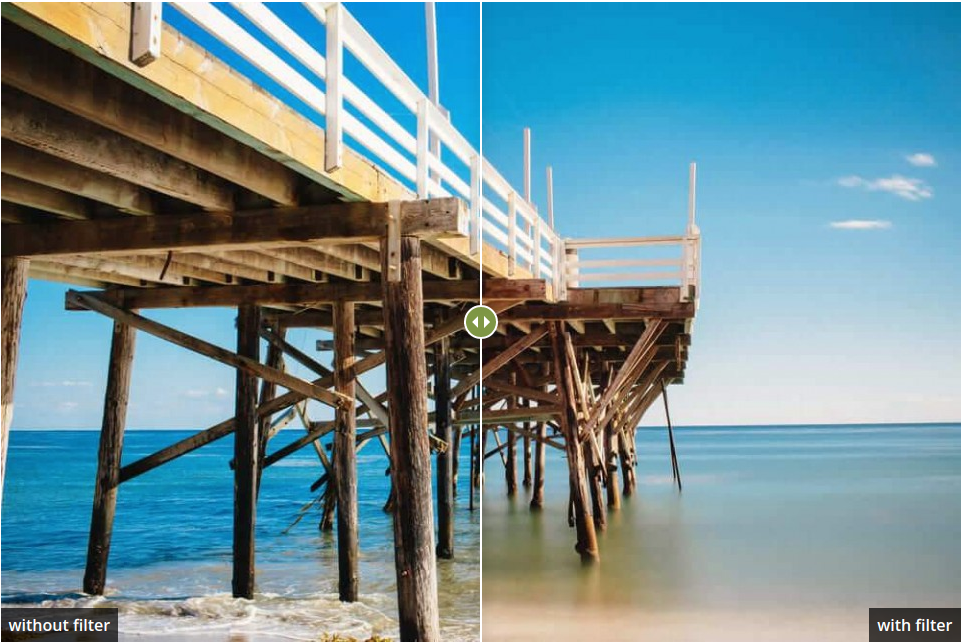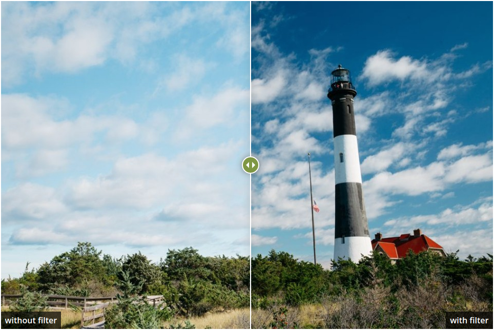 - Поляризационные фильтры уменьшают или устраняют отвлекающие отражения от поверхности стекла, воды и других полированных поверхностей, затемняют небо, выделяют облака из окружающей среды и насыщают цвет за счет уменьшения паразитных бликов.