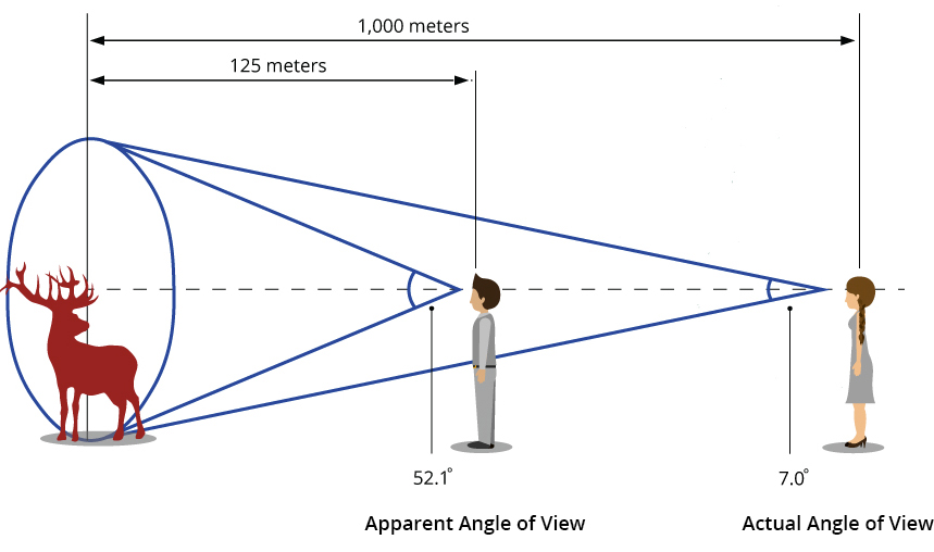 Чтобы показать взаимосвязь между увеличением и FoV, если бы этот бинокль был 10-кратным, а FoV был бы таким же, угол зрения остался бы 6,9 градусов, но видимый угол увеличился бы до 69 градусов.