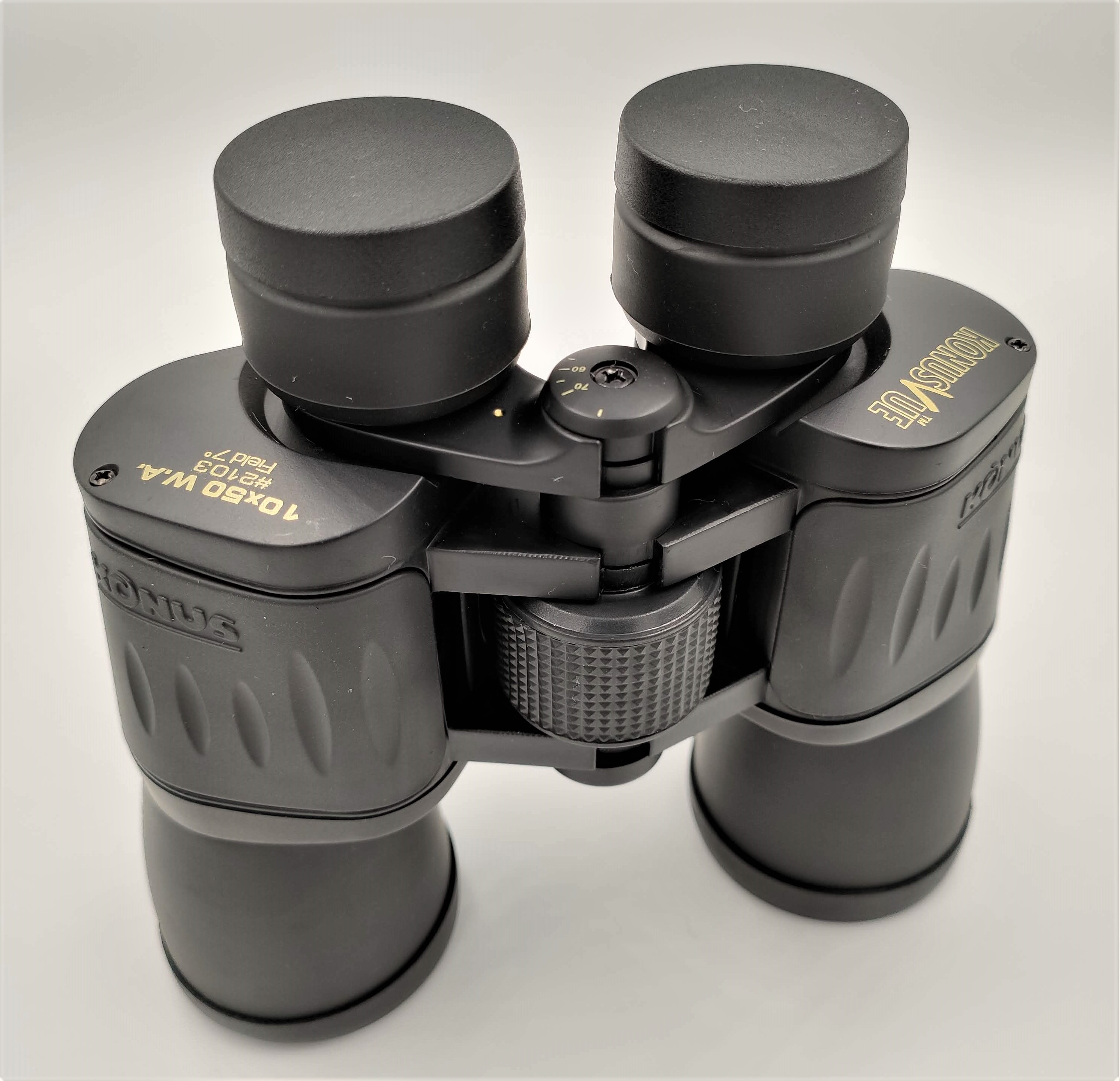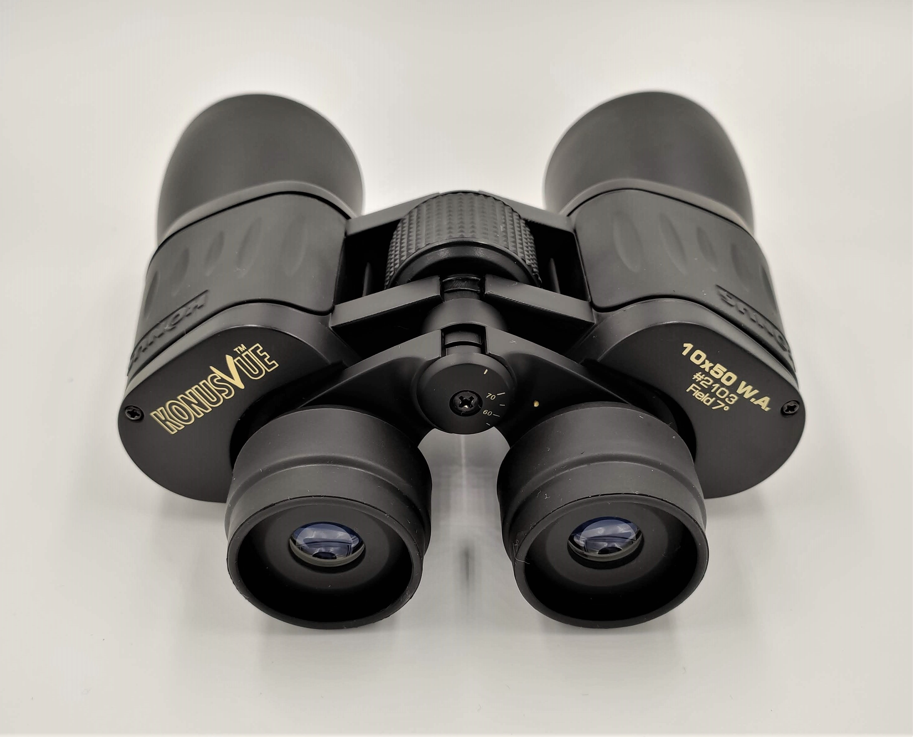 Бінокль Konus KonusVue 10x50 WA - класичний бінокль з повністю металевим корпусом, армованим нековзним гумовим покриттям чорного кольору. В оптичній конструкції бінокля використовуються ширококутні окуляри, що забезпечують дуже широкий кут огляду, отже, бінокль чудово підходить для проведення панорамних спостережень, а також спостережень за рухомими об'єктами. Цей бінокль може виявитися корисним мисливцеві, туристу, орнітологу тощо. Завдяки високій світлосилі бінокль придатний для спостережень як вдень, так і в сутінках. Бінокль побудований за класичною схемою із застосуванням Porro призм зі скла BK7, на лінзи нанесене спеціальне покриття, що просвітлює, для поліпшення яскравості та чіткості зображення.