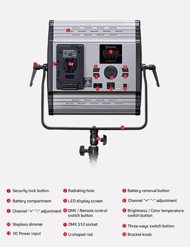 Всі органи управління Tolifo GK-S100B Pro розташовані на задній стороні освітлювача, поруч з якими передбачено інформативний екран і ряд індикаторів для відображення і налаштування параметрів LED панелі. Крім цього, LED панель Tolifo GK-S100B Pro оснащена двома портами DMX 512 (RJ45 - вхід і вихід) для управління освітлювачем за допомогою DMX контролерів, приймачем 2,4 ГГц, який дозволяє підключити комплектний пульт дистанційного керування і налаштовувати параметри освітлювача віддалено, на відстані до 50 метрів (є 99 каналів синхронізації), і модулем Wi-Fi для налаштування параметрів за допомогою Вашого смартфона або планшета.